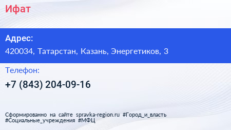 Ифат по адресу 420034, Татарстан, Казань, Энергетиков, 3 в дальнейшем Организация, размещена в следующих категориях:
