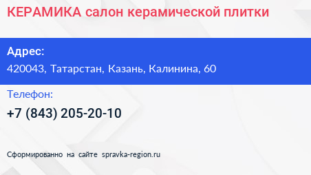 КЕРАМИКА, салон керамической плитки по адресу 420043, Татарстан, Казань, Калинина, 60 в дальнейшем Организация, размещена в следующих категориях: