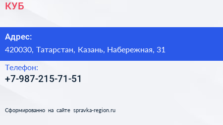КУБ+ по адресу 420030, Татарстан, Казань, Набережная, 31 в дальнейшем Организация, размещена в следующих категориях: