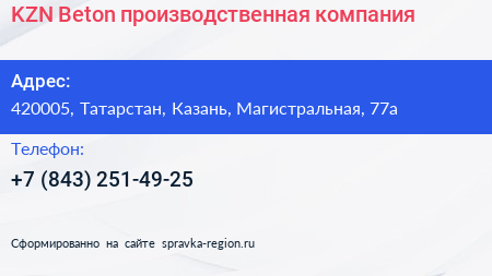 KZN Beton, производственная компания по адресу 420005, Татарстан, Казань, Магистральная, 77а в дальнейшем Организация, размещена в следующих категориях: