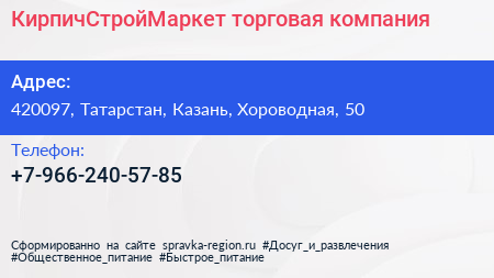 КирпичСтройМаркет, торговая компания по адресу 420097, Татарстан, Казань, Хороводная, 50 в дальнейшем Организация, размещена в следующих категориях:
