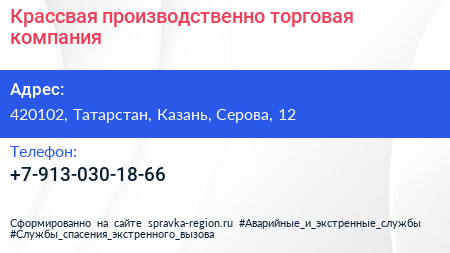 Крассвая, производственно-торговая компания по адресу 420102, Татарстан, Казань, Серова, 12 в дальнейшем Организация, размещена в следующих категориях: