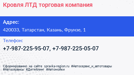 Кровля ЛТД, торговая компания по адресу 420033, Татарстан, Казань, Фрунзе, 1 в дальнейшем Организация, размещена в следующих категориях: