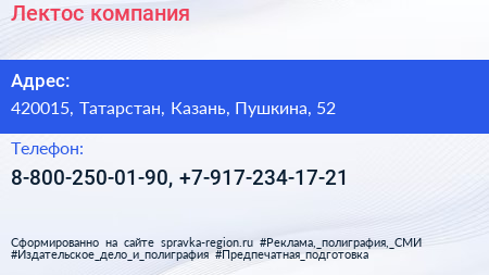 Лектос, компания по адресу 420015, Татарстан, Казань, Пушкина, 52 в дальнейшем Организация, размещена в следующих категориях: