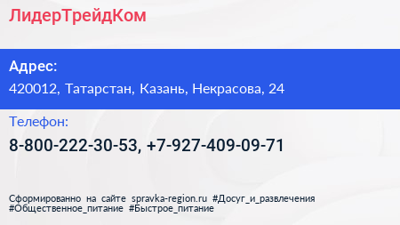 ЛидерТрейдКом по адресу 420012, Татарстан, Казань, Некрасова, 24 в дальнейшем Организация, размещена в следующих категориях:
