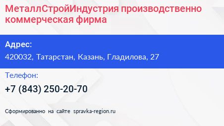 МеталлСтройИндустрия, производственно-коммерческая фирма по адресу 420032, Татарстан, Казань, Гладилова, 27 в дальнейшем Организация, размещена в следующих категориях:
