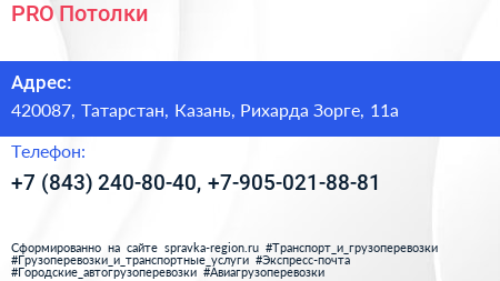 PRO Потолки по адресу 420087, Татарстан, Казань, Рихарда Зорге, 11а в дальнейшем Организация, размещена в следующих категориях: