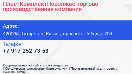 ПластКомплектПоволжье, торгово-производственная компания по адресу 420088, Татарстан, Казань, проспект Победы, 204 в дальнейшем Организация, размещена в следующих категориях: