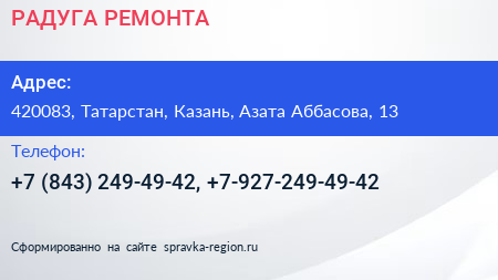 РАДУГА РЕМОНТА по адресу 420083, Татарстан, Казань, Азата Аббасова, 13 в дальнейшем Организация, размещена в следующих категориях: