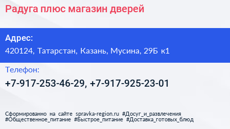 Радуга плюс, магазин дверей по адресу 420124, Татарстан, Казань, Мусина, 29Б к1 в дальнейшем Организация, размещена в следующих категориях: