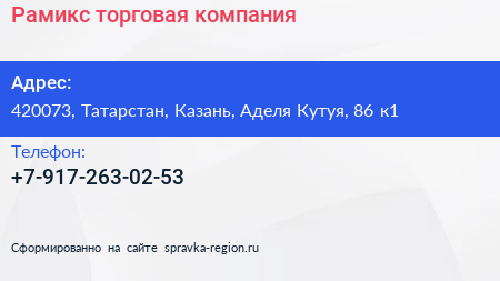 Рамикс, торговая компания по адресу 420073, Татарстан, Казань, Аделя Кутуя, 86 к1 в дальнейшем Организация, размещена в следующих категориях: