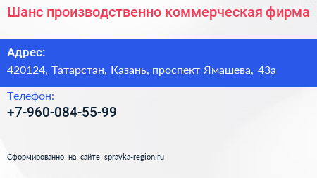 Шанс, производственно-коммерческая фирма по адресу 420124, Татарстан, Казань, проспект Ямашева, 43а в дальнейшем Организация, размещена в следующих категориях: