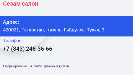 Сезам, салон по адресу 420021, Татарстан, Казань, Габдуллы Тукая, 3 в дальнейшем Организация, размещена в следующих категориях: