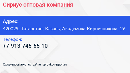 Сириус, оптовая компания по адресу 420029, Татарстан, Казань, Академика Кирпичникова, 19 в дальнейшем Организация, размещена в следующих категориях: