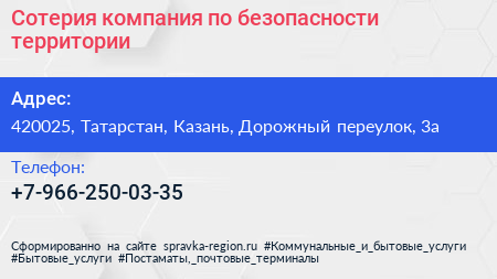 Сотерия, компания по безопасности территории по адресу 420025, Татарстан, Казань, Дорожный переулок, 3а в дальнейшем Организация, размещена в следующих категориях: