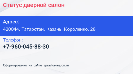 Статус, дверной салон по адресу 420044, Татарстан, Казань, Короленко, 28 в дальнейшем Организация, размещена в следующих категориях: