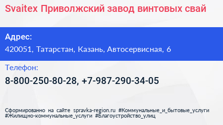 Svaitex, Приволжский завод винтовых свай по адресу 420051, Татарстан, Казань, Автосервисная, 6 в дальнейшем Организация, размещена в следующих категориях: