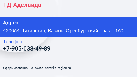 ТД Аделаида по адресу 420064, Татарстан, Казань, Оренбургский тракт, 160 в дальнейшем Организация, размещена в следующих категориях: