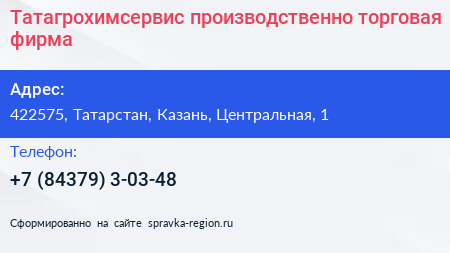 Татагрохимсервис, производственно-торговая фирма по адресу 422575, Татарстан, Казань, Центральная, 1 в дальнейшем Организация, размещена в следующих категориях: