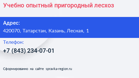 Учебно-опытный пригородный лесхоз по адресу 420070, Татарстан, Казань, Лесная, 1 в дальнейшем Организация, размещена в следующих категориях: