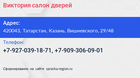 Виктория, салон дверей по адресу 420043, Татарстан, Казань, Вишневского, 29/48 в дальнейшем Организация, размещена в следующих категориях:
