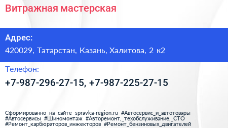 Витражная мастерская по адресу 420029, Татарстан, Казань, Халитова, 2 к2 в дальнейшем Организация, размещена в следующих категориях: