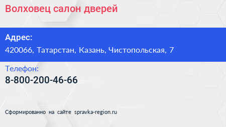 Волховец, салон дверей по адресу 420066, Татарстан, Казань, Чистопольская, 7 в дальнейшем Организация, размещена в следующих категориях: