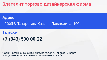 Златалит, торгово-дизайнерская фирма по адресу 420059, Татарстан, Казань, Павлюхина, 102а в дальнейшем Организация, размещена в следующих категориях: