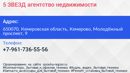 5 ЗВЕЗД, агентство недвижимости по адресу 650070, Кемеровская область, Кемерово, Молодёжный проспект, 9 в дальнейшем Организация, размещена в следующих категориях:
