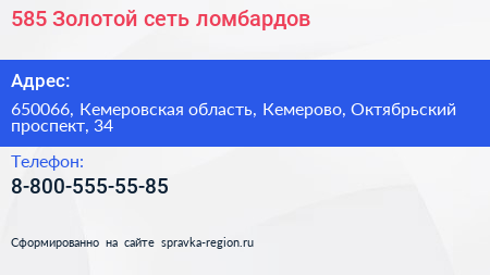 585*Золотой, сеть ломбардов по адресу 650066, Кемеровская область, Кемерово, Октябрьский проспект, 34 в дальнейшем Организация, размещена в следующих категориях: