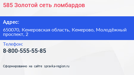 585*Золотой, сеть ломбардов по адресу 650070, Кемеровская область, Кемерово, Молодёжный проспект, 2 в дальнейшем Организация, размещена в следующих категориях: