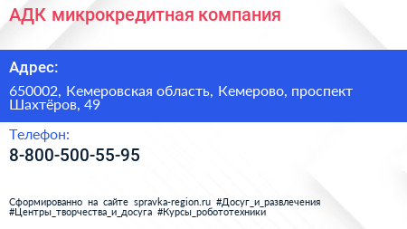 АДК, микрокредитная компания по адресу 650002, Кемеровская область, Кемерово, проспект Шахтёров, 49 в дальнейшем Организация, размещена в следующих категориях: