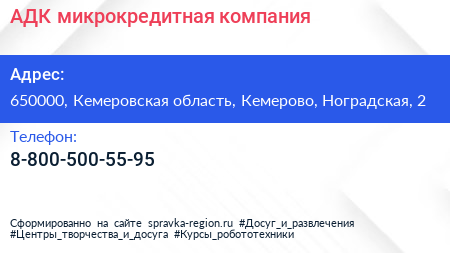 АДК, микрокредитная компания по адресу 650000, Кемеровская область, Кемерово, Ноградская, 2 в дальнейшем Организация, размещена в следующих категориях: