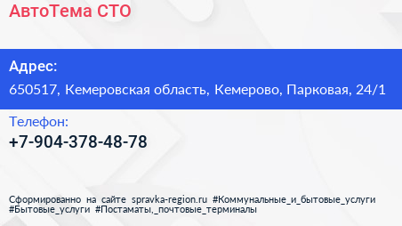 АвтоТема, СТО по адресу 650517, Кемеровская область, Кемерово, Парковая, 24/1 в дальнейшем Организация, размещена в следующих категориях: