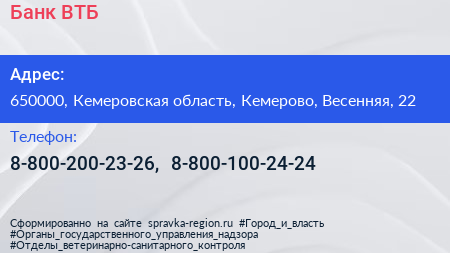 Банк ВТБ по адресу 650000, Кемеровская область, Кемерово, Весенняя, 22 в дальнейшем Организация, размещена в следующих категориях: