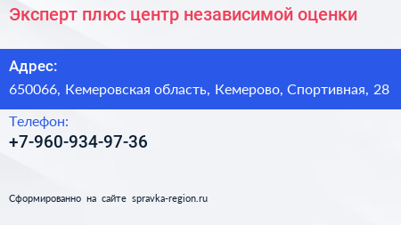 Эксперт-плюс, центр независимой оценки по адресу 650066, Кемеровская область, Кемерово, Спортивная, 28 в дальнейшем Организация, размещена в следующих категориях: