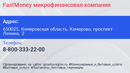 FastMoney, микрофинансовая компания по адресу 650025, Кемеровская область, Кемерово, проспект Ленина, 2 в дальнейшем Организация, размещена в следующих категориях: