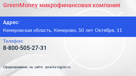 GreenMoney, микрофинансовая компания по адресу Кемеровская область, Кемерово, 50 лет Октября, 11 в дальнейшем Организация, размещена в следующих категориях: