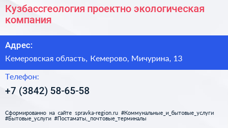 Кузбассгеология, проектно-экологическая компания по адресу Кемеровская область, Кемерово, Мичурина, 13 в дальнейшем Организация, размещена в следующих категориях: