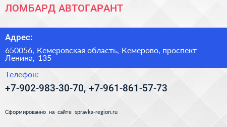 ЛОМБАРД АВТОГАРАНТ по адресу 650056, Кемеровская область, Кемерово, проспект Ленина, 135 в дальнейшем Организация, размещена в следующих категориях:
