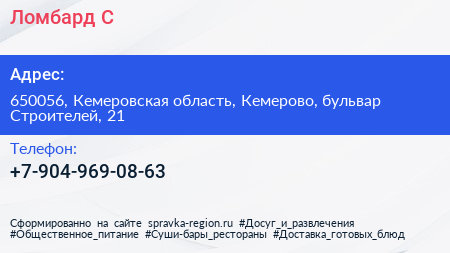 Ломбард-С по адресу 650056, Кемеровская область, Кемерово, бульвар Строителей, 21 в дальнейшем Организация, размещена в следующих категориях: