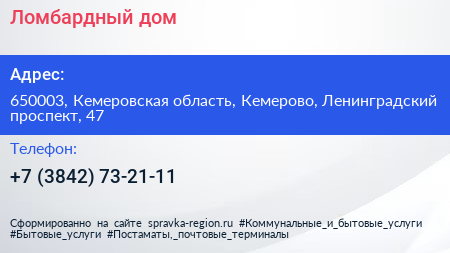 Ломбардный дом по адресу 650003, Кемеровская область, Кемерово, Ленинградский проспект, 47 в дальнейшем Организация, размещена в следующих категориях: