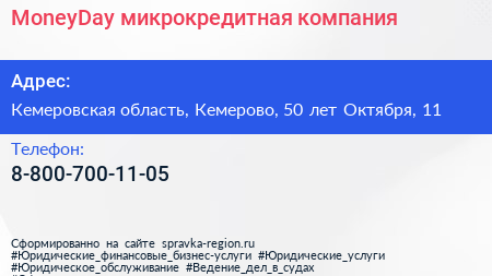 MoneyDay, микрокредитная компания по адресу Кемеровская область, Кемерово, 50 лет Октября, 11 в дальнейшем Организация, размещена в следующих категориях: