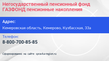 Негосударственный пенсионный фонд ГАЗФОНД пенсионные накопления по адресу Кемеровская область, Кемерово, Кузбасская, 33а в дальнейшем Организация, размещена в следующих категориях: