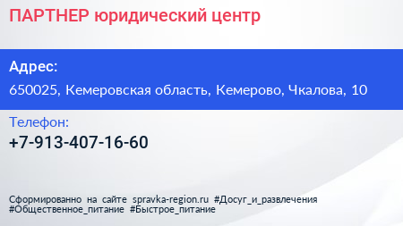 ПАРТНЕР, юридический центр по адресу 650025, Кемеровская область, Кемерово, Чкалова, 10 в дальнейшем Организация, размещена в следующих категориях: