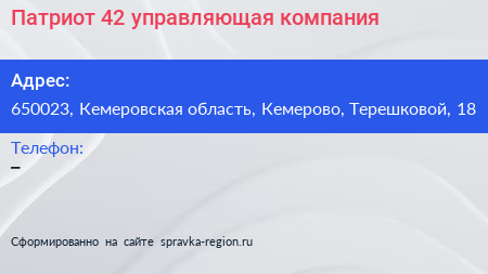 Патриот-42, управляющая компания по адресу 650023, Кемеровская область, Кемерово, Терешковой, 18 в дальнейшем Организация, размещена в следующих категориях: