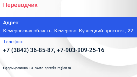 Переводчик по адресу Кемеровская область, Кемерово, Кузнецкий проспект, 22 в дальнейшем Организация, размещена в следующих категориях: