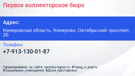 Первое коллекторское бюро по адресу Кемеровская область, Кемерово, Октябрьский проспект, 2Б в дальнейшем Организация, размещена в следующих категориях: