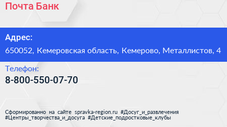 Почта Банк по адресу 650052, Кемеровская область, Кемерово, Металлистов, 4 в дальнейшем Организация, размещена в следующих категориях: