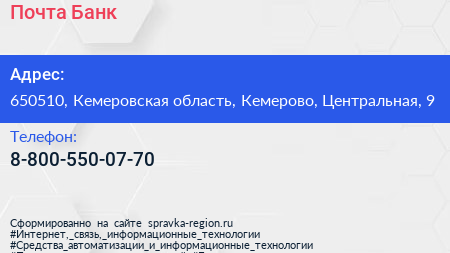 Почта Банк по адресу 650510, Кемеровская область, Кемерово, Центральная, 9 в дальнейшем Организация, размещена в следующих категориях: